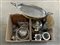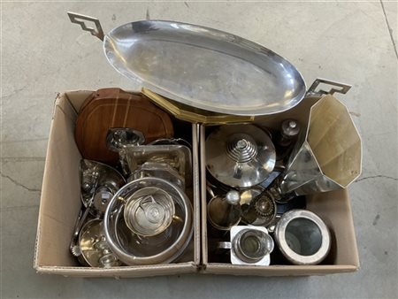 Lotto di due cartoni contenenti numerosi oggetti, principalmente per la tavola, in metallo argentato (difetti)