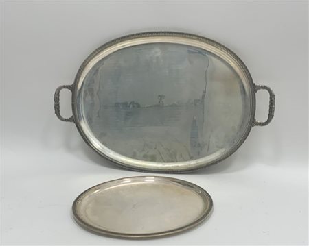 Lotto composto da un vassoio ovale biansato e uno tondo decorati con bordo a palmette (g 1600) (l max cm 57) (difetti)