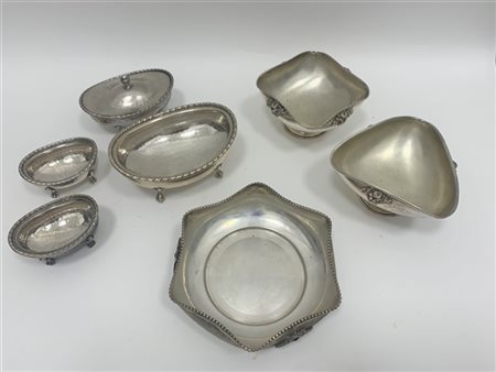 Lotto composto da sette oggetti in argento di manifatture e dimensioni differenti (g 650) (lievi difetti)