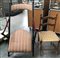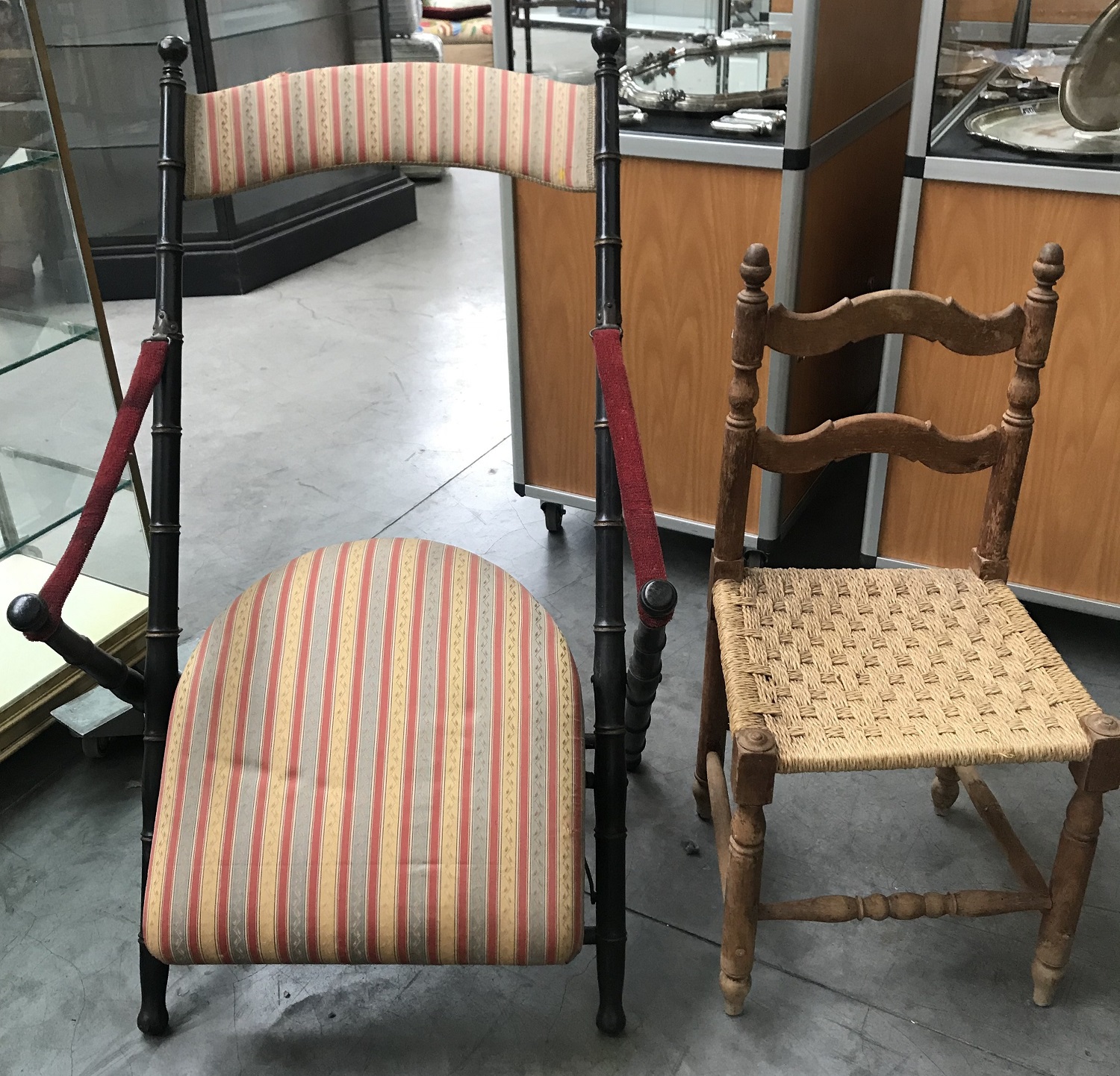 * Lotto composto da quattro sedie, una poltroncina girevole ex una pieghevole, in legno, ferro e stoffa (difetti e mancanze)