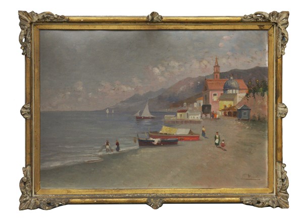 G. Morelli "Paesaggio marino con barche" olio su compensato (cm 70x100) firmato