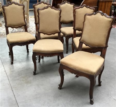 Gruppo di sei sedie in noce con schienale, fascia e gambe sagomate e intagliate a ricciolo (quattro del secolo XVIII e due di epoca posteriore) (difetti e restauri)