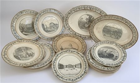 Manifattura francese Stone Coquerel et le Cros. Parte di servizio di piatti in terraglia decorata a paesaggi in monocromia, composto da un piatto fondo e sette piani, otto piatti da frutta e due piatti ovali da portata (gravi difetti)