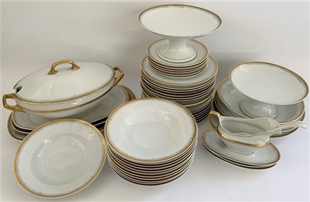 Manifattura cecoslovacca. Servizio da tavola in porcellana con profili dorati composto da dodici piatti fondi, trentasei piani, dodici da frutta, due alzatine, tre piatti da portata ovali e due tondi, due raviere, insalatiera, zuppiera e salsiera con mestolo (lievi difetti)