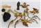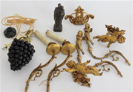 Lotto composto da quattro bracci di applique, tre elementi decorativi, una scultura di figura di santo con fanciullo ed una lampada a forma di grappolo d'uva in metallo dorato e altri materiali (difetti e mancanze)