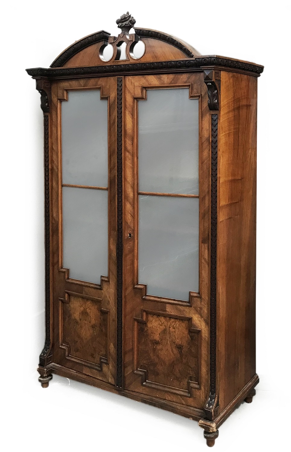 Armadio da ufficio in noce intagliato a motivi rinascimentali (cm 181x189x51) (difetti)