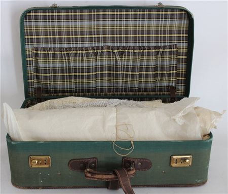 Lotto di numerosi tessuti e pizzo sangallo, fillet, al tombolo, centrini e biancheria per la casa in cotone, lino e seta contenuti in valigia in tela.