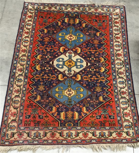 Disegno a tre medaglioni romboidali su fondo azzurro. (cm 192x143) (Lievi difetti)