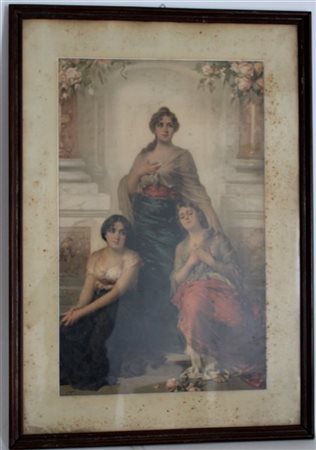Stampa a colori raffigurante una riproduzione di un dipinto del secolo XIX (cm 96x66), in cornice (difetti)