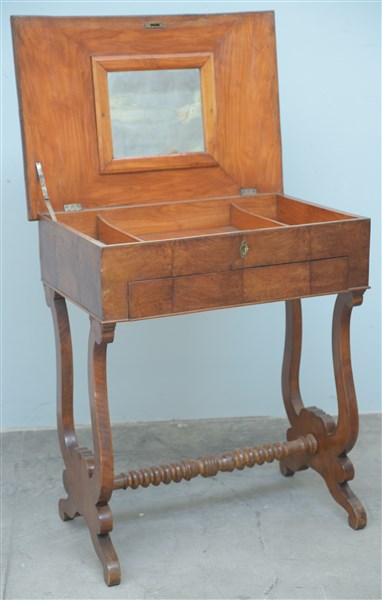 Tavolino da lavoro lastronato in noce e radica di noce, piano apribile celante vani e specchio, cassetto nella fascia, gambe sagomate riunite da traversa tornita, secolo XIX (cm 70x82x47) (difetti)
