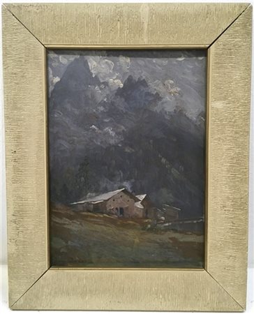 "San Martino di Castroza" olio su cartone (cm 27,5x20) firmato in baso a sinistra, firmato, titolato e iscritto al retro, in cornice