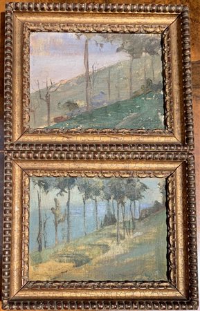 Firma indecifrata "Paesaggi" coppia di olio su cartone telato (cm 15x20) firmati in basso a destra, in cornici