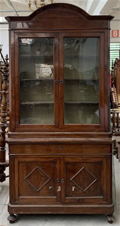 Mobile a due corpi con parte inferiore a due ante e cassetto sottopiano, parte superiore con due ante a vetri, cimasa sagomata. Sec. XIX (cm 124x242x47) (difetti)