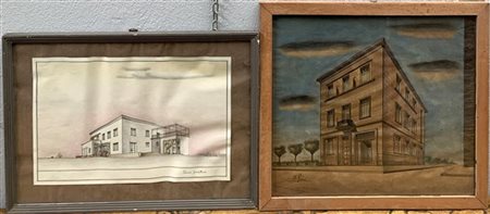 Lotto di un disegno a matita colotare ed uno acquarellato raffiguranti vedute prospettiche di case, autori e misure diverse, in cornici (difetti)