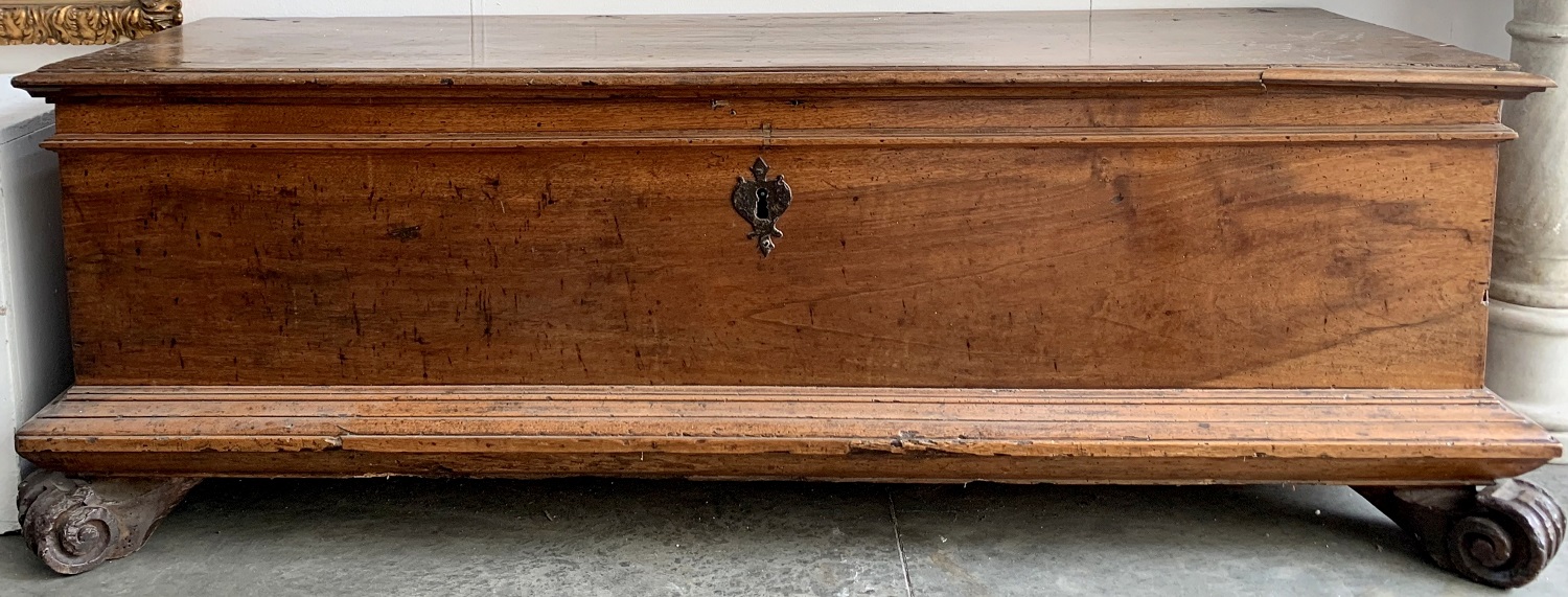Antico cassone in noce a corpo liscio con piedi scolpiti e maniglie sui fianchi