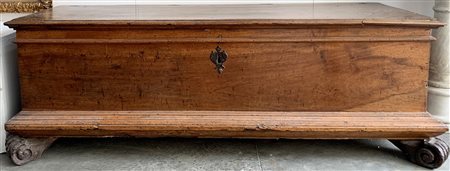 Antico cassone in noce a corpo liscio con piedi scolpiti e maniglie sui fianchi in ferro battuto (cm 182x59x60) (difetti, restauri e mancanze)