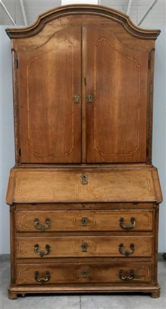 Antico mobile a due corpi con parte inferiore a tre cassetti e ribalta celante cinque cassettini, parte superiore a due sportelli. Specchiature decorate con filettature intarsiate (cm 127x232x57) (difetti e restauri)