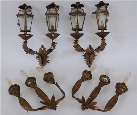 Lotto composto da una coppia di appliques a due fiamme a forma di lanterna ed una coppia a tre fiamme a forma di foglia, in ferro metallo e legno (difetti e mancanze)