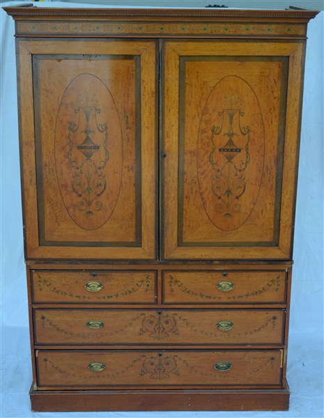 Credenza lastronata e filettata decorata a motivi floreali, fiori e volute. Parte superiore a due ante riquadrate, parte inferiore a due cassetti piccoli e due grandi sul fronte. Fine sec. XIX (cm 140x207x55) (difetti)