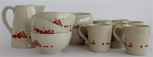 Servizio da colazione in ceramica composto da una brocca, sei tazze e sei ciotole in ceramica (lievi difetti)