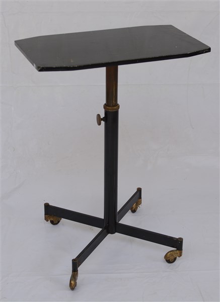 Tavolino portatelevisore con piano in legno vernciato nero struttura in ottone e metallo verniciato nero. Italia, 50. (cm 58x77x35) (difetti)