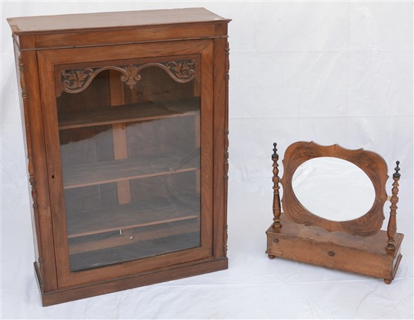 Lotto composto da una psiche da tavolo lastronata in noce ed una vetrinetta ad un anta decorata a volute (difetti, restauri e mancanze)