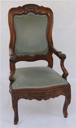 Poltrona con schienale, braccioli, fascia e gambe sagomate ed intagliate a conc