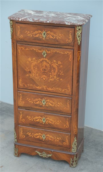 Mobiletto lastronato e filettato, fronte intarsiato a motivi floreali a quattro cassetti a antina ribaltabile celante due cassettini e vano, fregi in bronzo cesellato, piano in marmo (cm 66x139x34) (difetti)