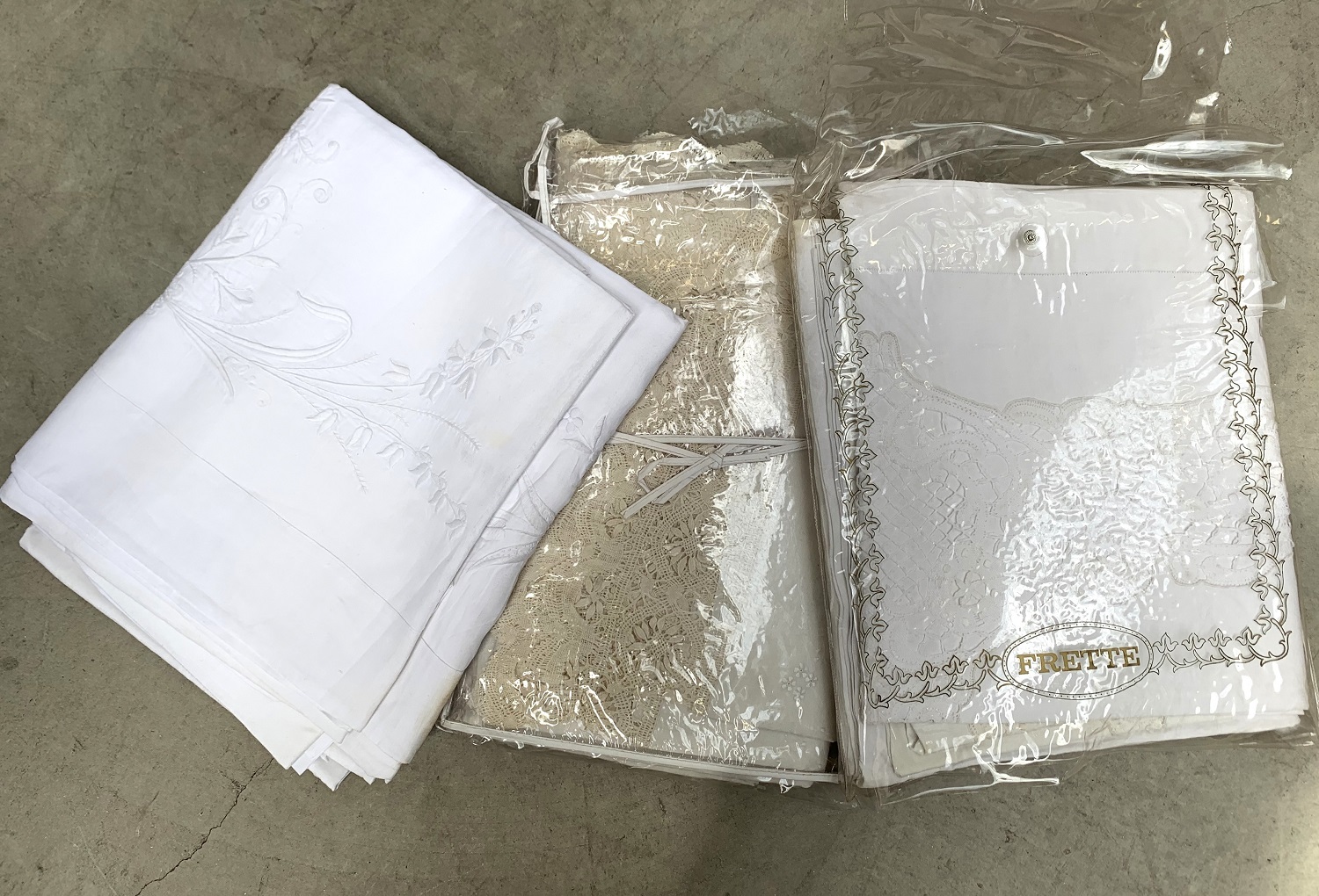 Lotto composto da cinque lenzuola matrimoniali alcune corredate da federe e un sacchetto di biancheria varia.