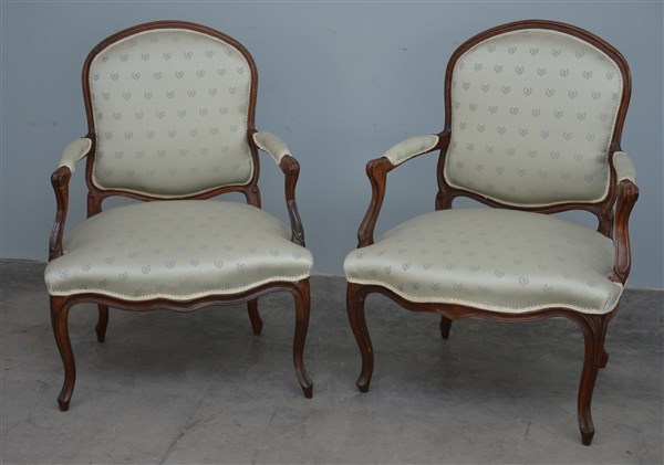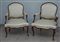 Coppia di poltrone con montanti, gambe e fascia sagomate e scanalate, rivestito
