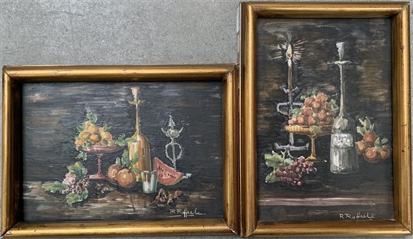 R. Raffaele Coppia di dipinti su terracotta raffiguranti "Nature morte" (cm 13.5