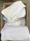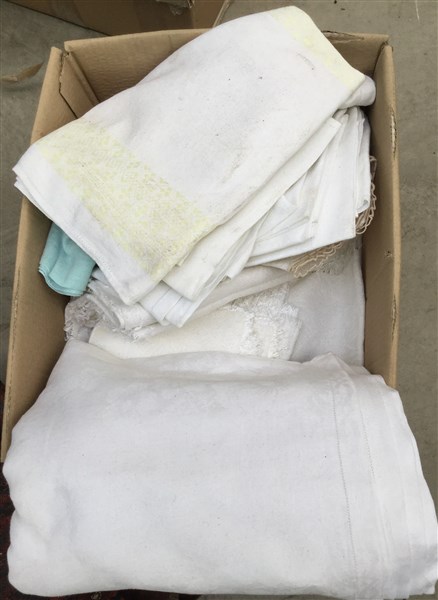 Cartone contenente numerosi tessuti: tovaglie, tovaglioli, tovagliette e centro