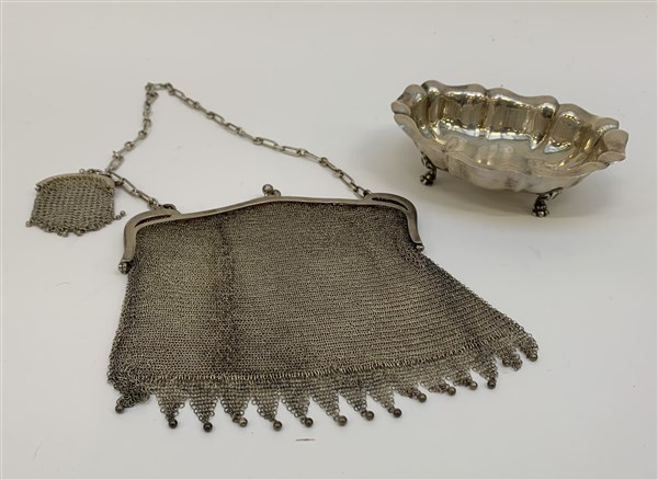 Lotto composto da un'alzatina ed una borsa a maglia in argento (g 390 ca.)