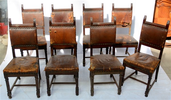 Gruppo di otto sedie in stile rinascimentale rivestite in pelle (gravi difetti)