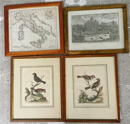 Lotto di quattro stampe di soggetto, misure ed epoche diverse (difetti)