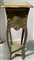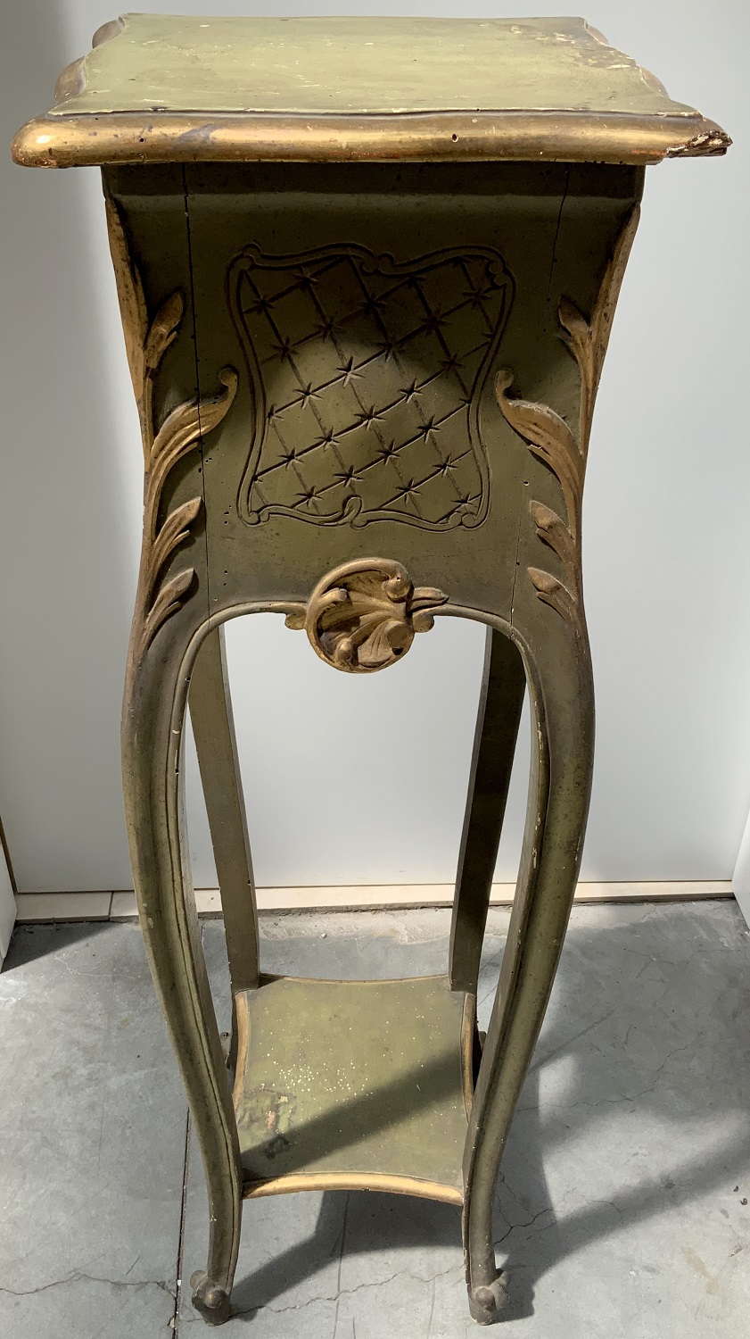 Gueridon di forma mossa in legno intagliato, laccato e dorato, gambe riunite da un pianetto (cm 31x103x31) (difetti)