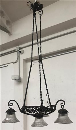 Lampadario a quattro luci in ferro battuto e paralumi in vetro (h cm 120) (difetti)