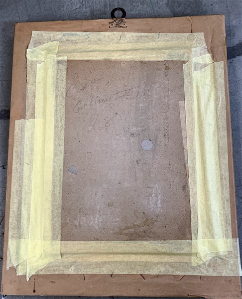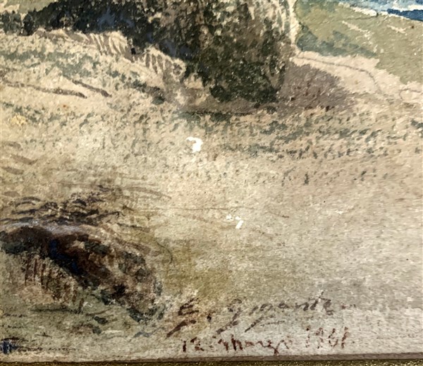 "Paesaggio con rovine" acquerello su carta applicata a cartone pressato (cm 30x22) Firmato e datato 12.marzo.1867 in basso a sinistra. In cornice (difetti)