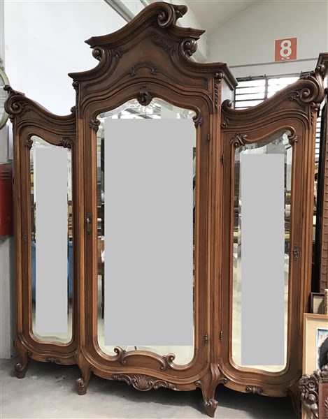 Armadio a tre ante a specchio di struttura architettonica con cimasa intagliata