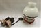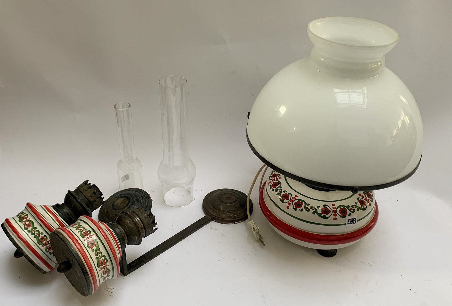 Lotto composto da due appliques e una lampada ad olio in ceramica decorata in policromia e metallo (applique h. cm 15
