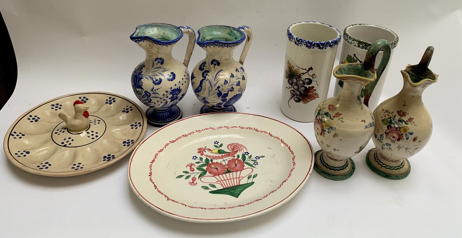 Lotto composto da quattro brocche, due vasi, un piatto porta uova e un piatto da portata in ceramica decorata in policromia (difetti)