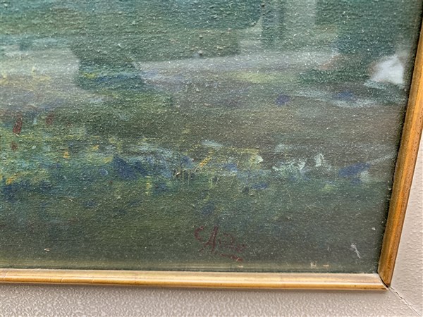 Firma indecifrata "Paesaggio montano con pastorella e gregge" olio su tela (cm
