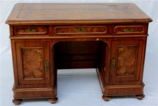 Scrivania da centro lastronata in noce con tre cassetti in linea e due ante. Piedi torniti. Lombardia, secolo XIX (cm 126x83x66) (difetti)