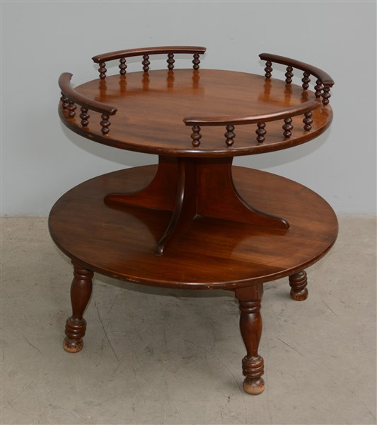 Tavolino tondo in legno a due ripiani con ringhiera e piedi torniti ( cm 74x72x74) (difetti)