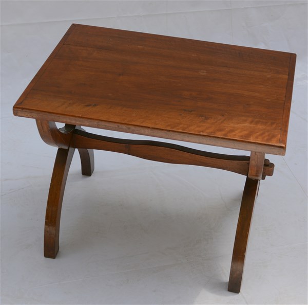 Lotto 1598 | Tavolino con struttura in legno massello e bordato, gambe incrociate unite da t