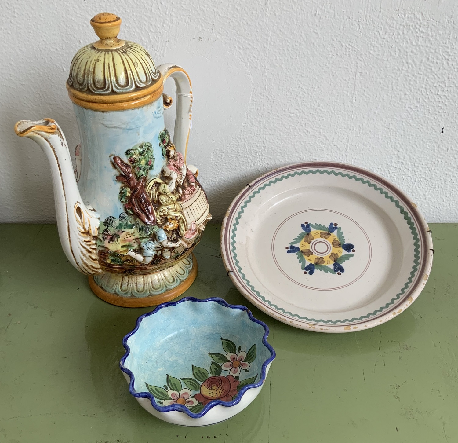Lotto composto da una brocca, un piatto ed una ciotola in ceramica policroma. Epoche e misure diverse (difetti)