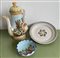 Lotto composto da una brocca, un piatto ed una ciotola in ceramica policroma. E