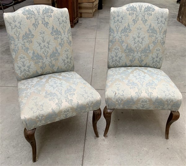Coppia di sedie da camera imbottite, gambe sagomate in legno, rivestite in tessuto operato