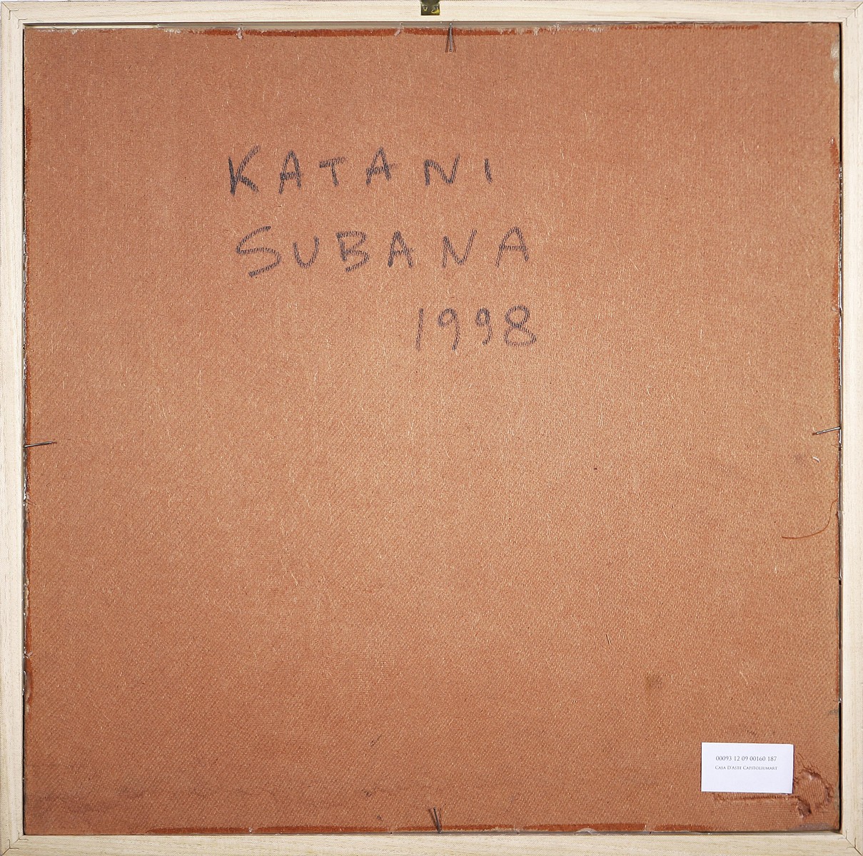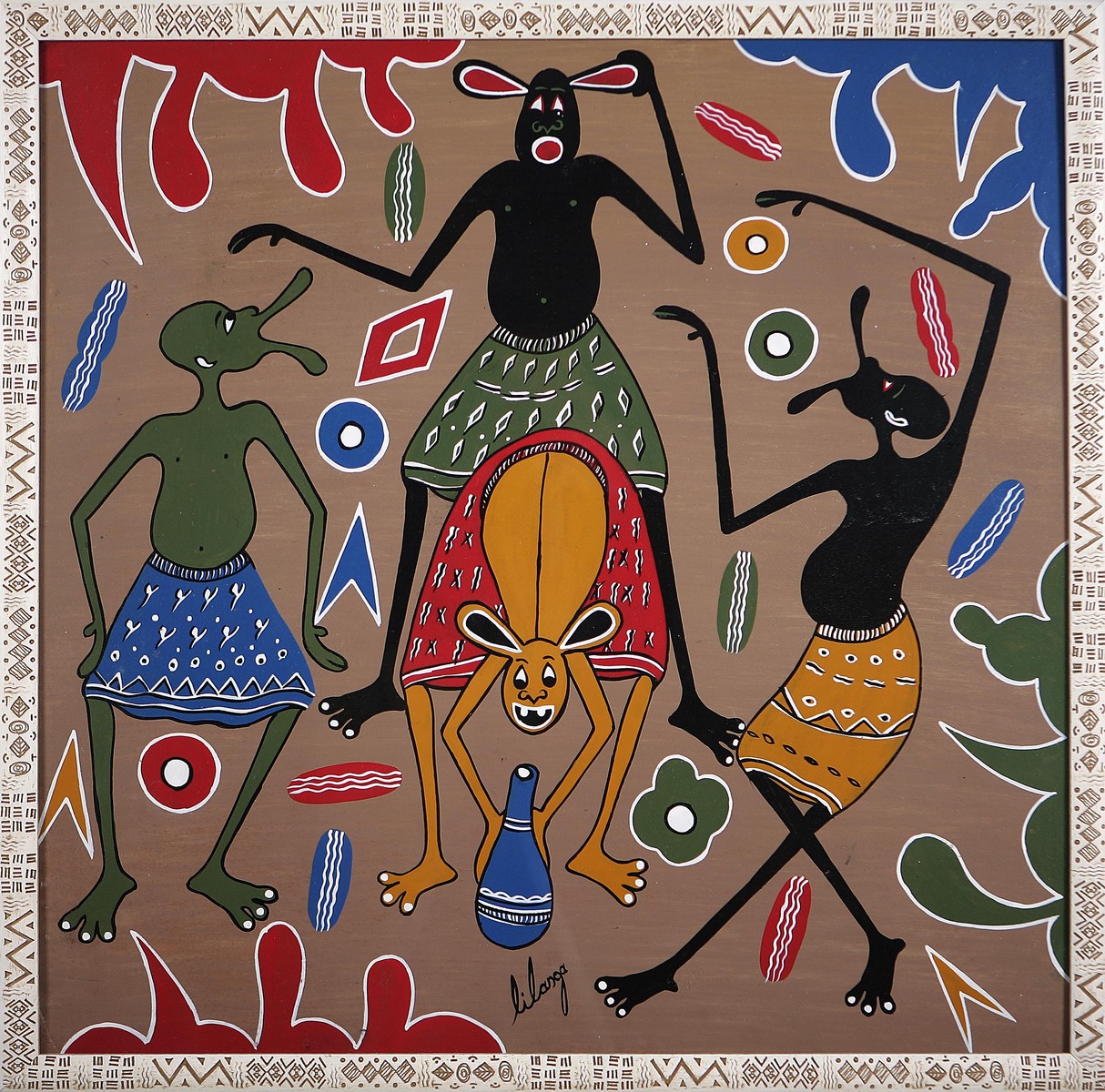 LILANGA GEORGE (1940 - 2005) Katani Subana, 1998. Tecnica mista su compensato. Cm 60x60. Autentica su fotografia di Captain Felix Lorenz. Firma in basso al centro. Al retro titolo e data.