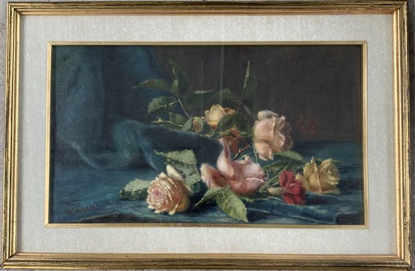"Composizione con fiori" olio su tela (cm 36x58) Firmato in basso a sinistra. In cornice